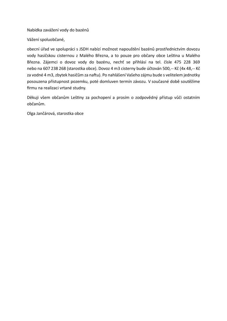 Nabídka zavážení vody do bazénů pro občany obce Leština u Malého Března
