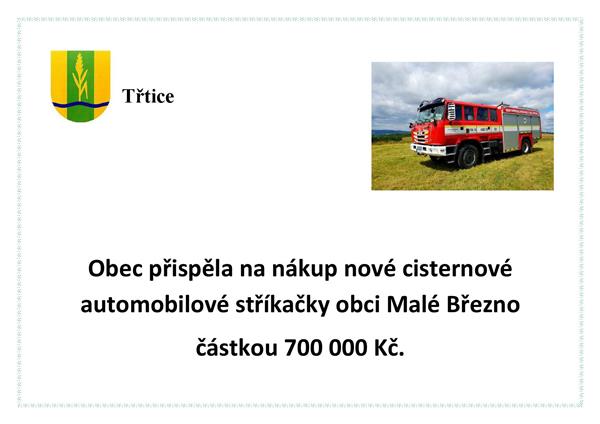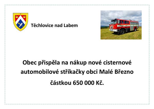 Obec přispěla na nákup nové cisternové automobilové stříkačky obci Malé Březno